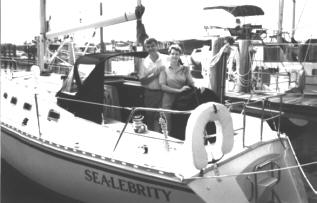 | scrutinizing boats, deciding which one to buy. They purchased their Caliber 35, "Sea*lebrity," in 1992 and have sailed her around Chesapeake Bay and on the TVA lake system near their current home. Their plans call for offshore voyages to the Bahamas and Caribbean, through the Panama Canal, and to the West Coast. Perhaps Hawaii and beyond. They were looking for a boat that could fulfill their dreams. | |